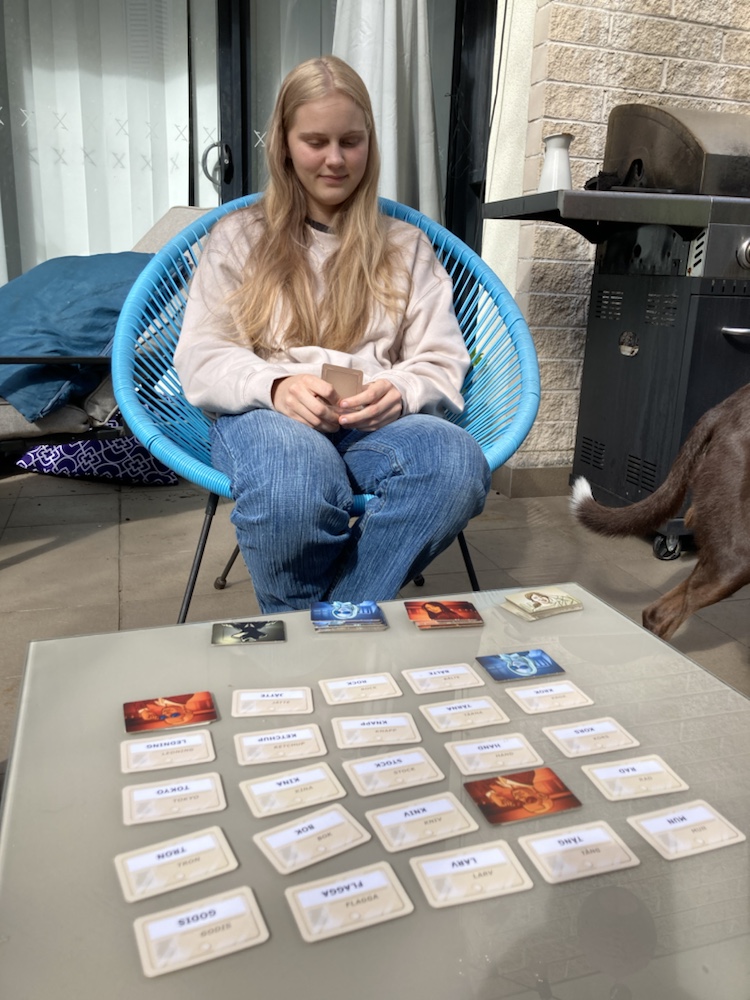 Vi fick ett spel av Rosendahls när de var här där det svenska ordförrådet behöver vara bra. Det är så kul att spela med Tilda då vi får förklara ett ords betydelse i många olika sammanhang