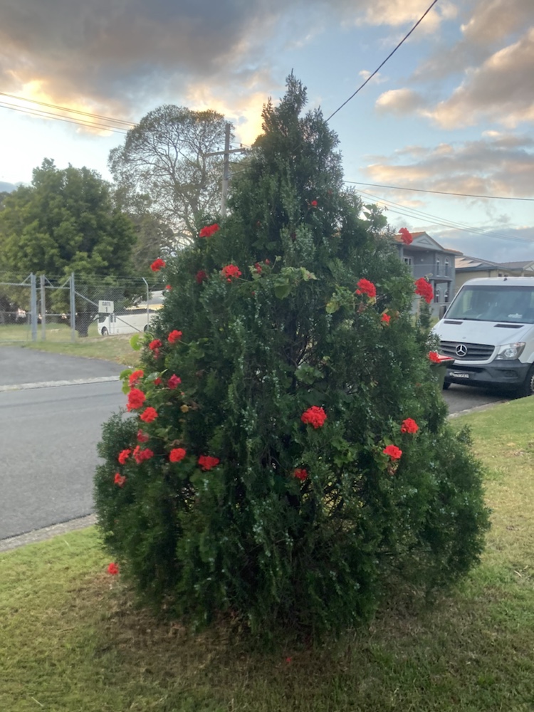 Vi går ju ofta samma runda eller springer den. Den är fem km från dörr till dörr och det är så smidigt då man aldrig korsar några vägar plus att vi alltid har hundarna lösa. Jag fnissar rätt ofta åt denna julgran. Det växer pelargoner under den och de kommer ut med sina blommor som julgranskulor
