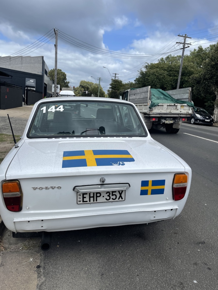 Tror kanske mest att de hade flagga på för att det var en gammal Volvo. Detta var utanför en mekaniker som bara renoverade gamla bilar.