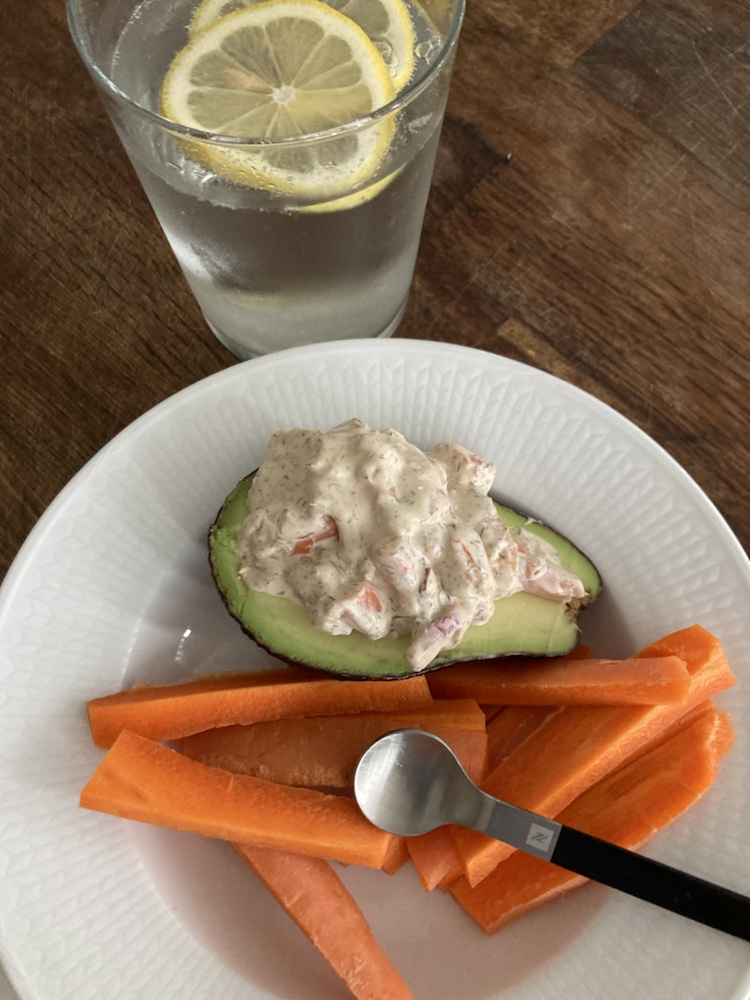 Lycka är att hitta lite skagenröra kvar från söndagens middag och fylla en avokado för lunch.